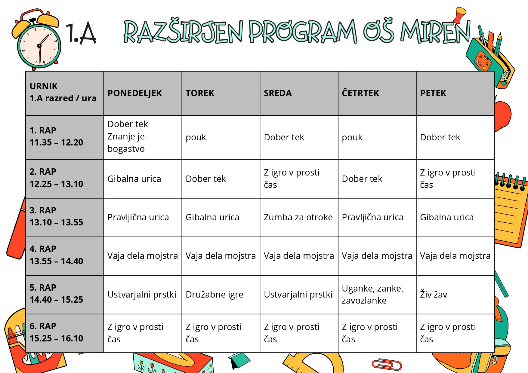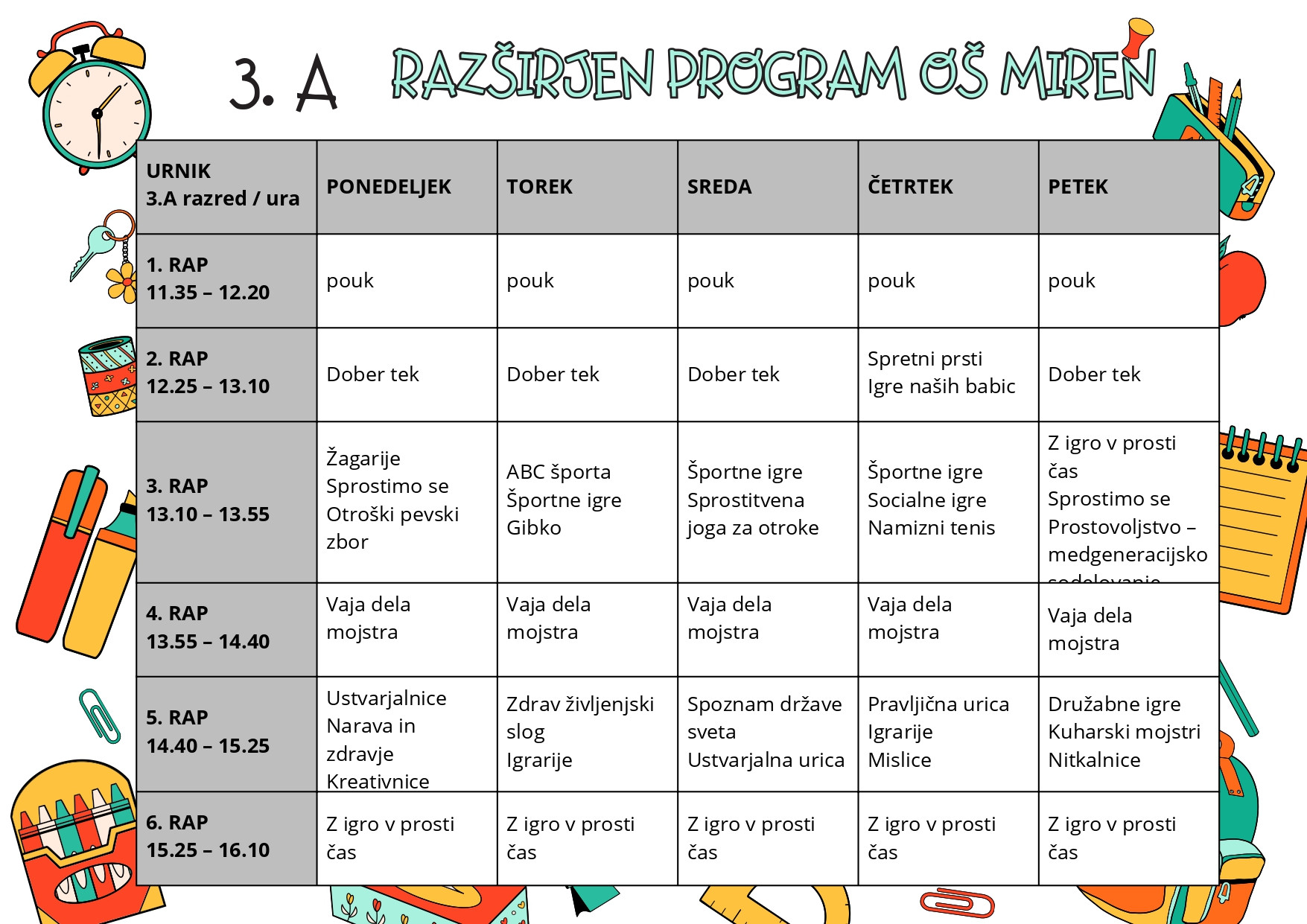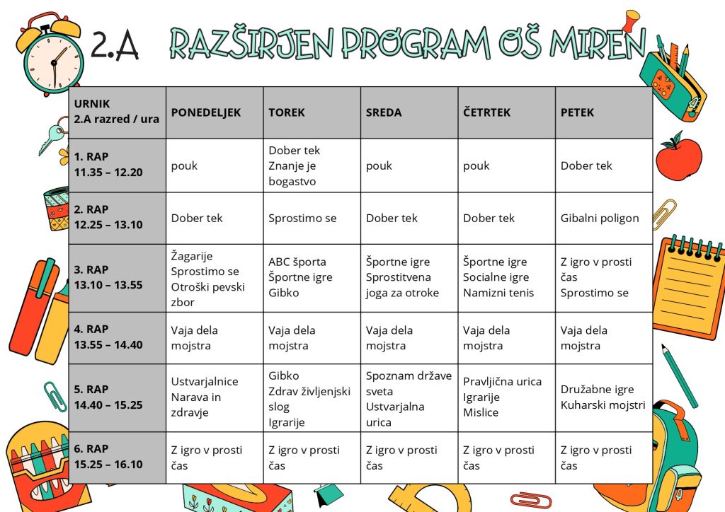 | Malica in rekreativni odmor | 9.25 – 9.55 |